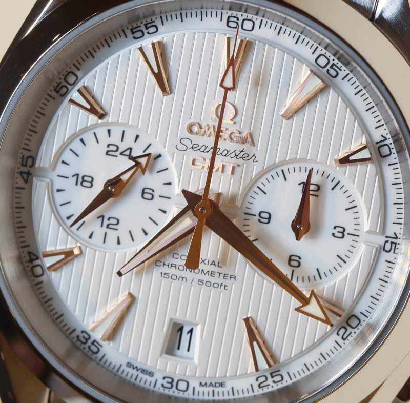 在歐米茄 Aqua Terra Chronograph GMT 手表上使用 GMT 復(fù)雜功能與您在其他 GMT 手表中所期望的一樣,只是指針更小并且位于輔助表盤中。它確實(shí)使它更難閱讀,但歐米茄確實(shí)在提供易讀性方面做得很好。盡管 24 小時(shí)指示器的小表盤和標(biāo)記與阿拉伯?dāng)?shù)字刻度相比,您不太可能一眼就能讀出第二時(shí)區(qū)。在某些型號上,GMT 指針為紅色,而在其他型號上則為金色以匹配其他細(xì)節(jié)。
